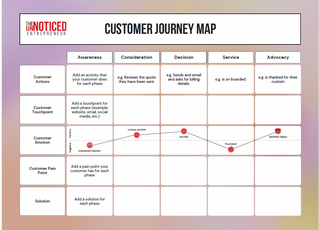 If you already have an established business but haven't mapped out your customer's journey, you may be missing opportunities to improve their experience and increase sales. Mapping the customer journey allows you to identify pain points and moments of delight across the key stages of Awareness, Consideration, Decision, Purchase, and Advocacy.