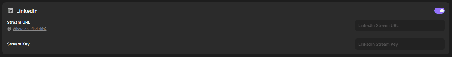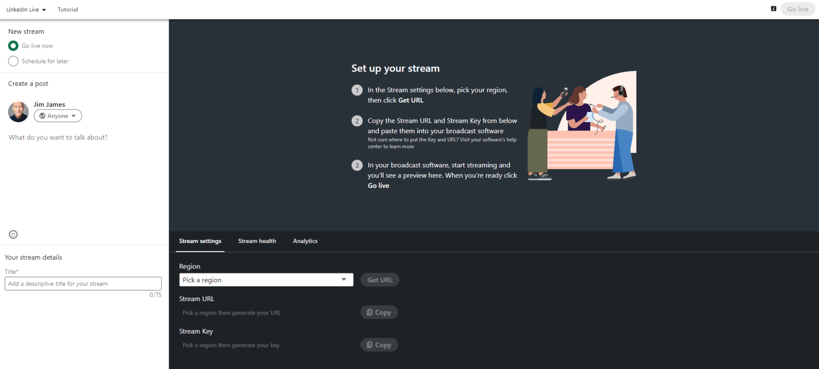 Note: If you plan to Schedule a LinkedIn live stream, the Stream Key and Stream URL are only made available by LinkedIn one hour before the scheduled time.