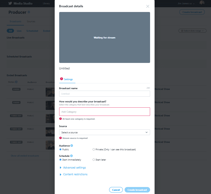 Go to Twitter Media Studio's Broadcasts page and select the Broadcasts tab.